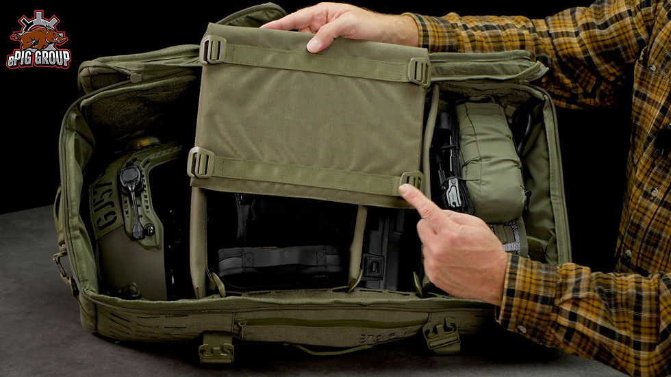 Die Oberseite besticht durch zwei Klettflächen, die ebenfalls PALS Schlitze haben, um Zusatztaschen ...