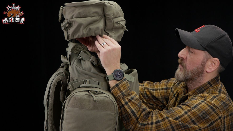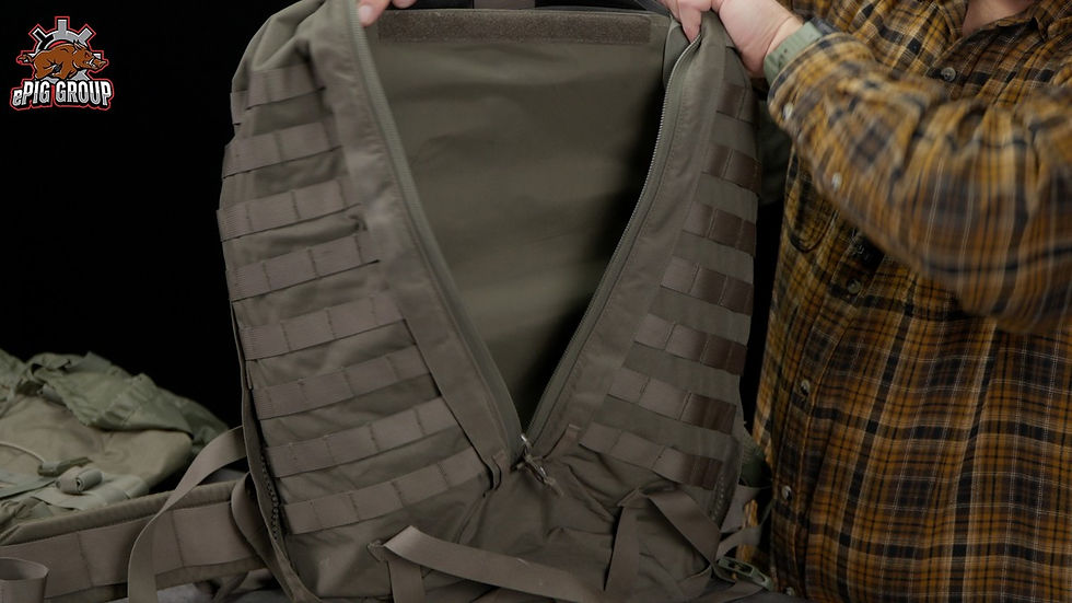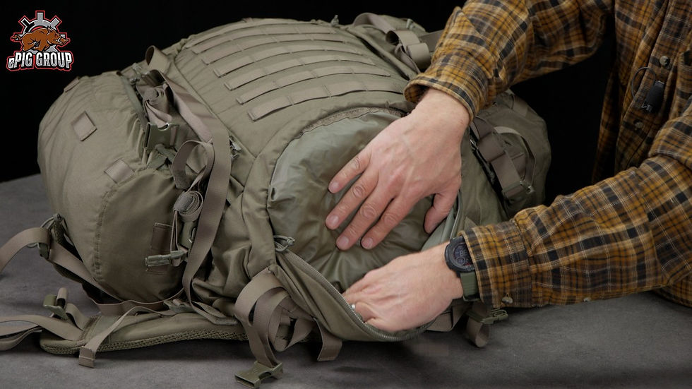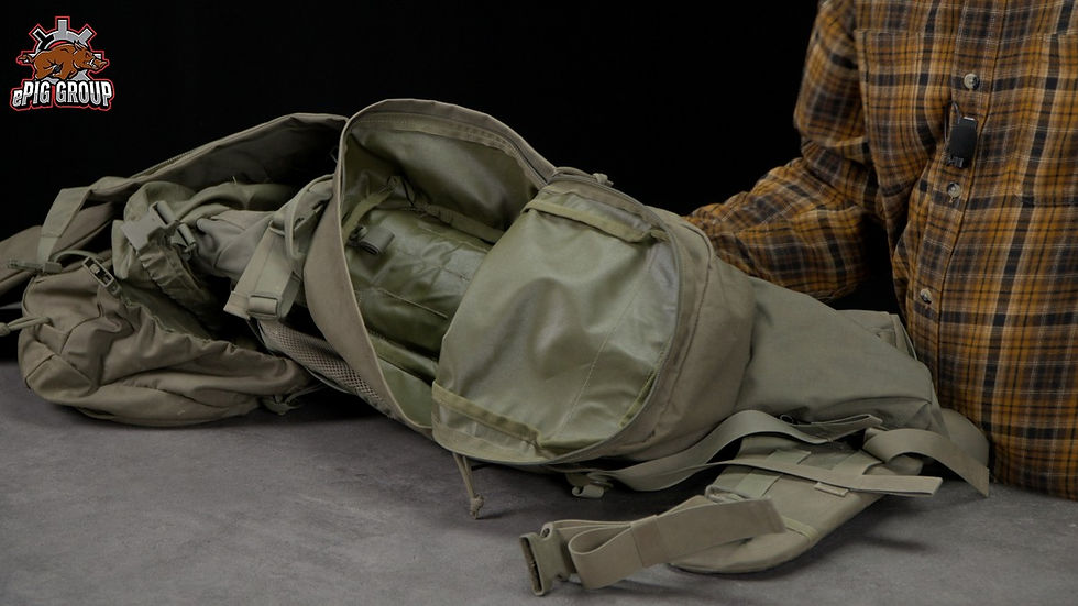 Wesentliche Unterschiede zum Snigel ist die Helmhalterung an der Front, das größere Schlafsackfach und die Seitentaschen, die mit PALS befestigt sind.