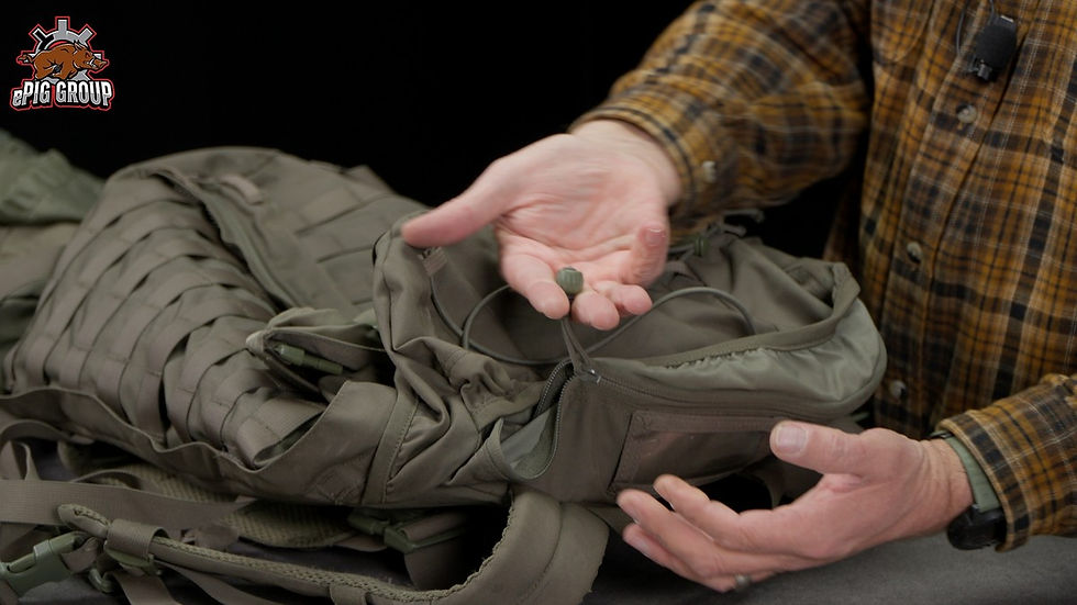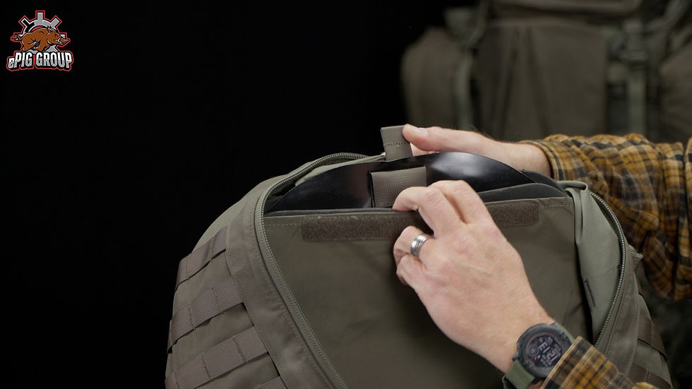 Die Seitentaschen haben ein Volumen von 12 Litern und sind mit dem MOLLE System an den PALS Schlaufen des Rucksacks befestigt. Bei Bedarf können sie abgenommen werden und z.B. auch an den kleinen Rucksack eingeschlauft werden.